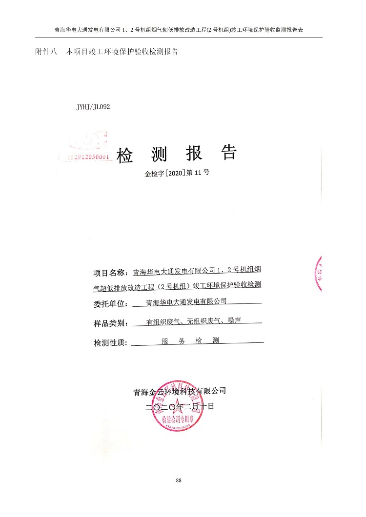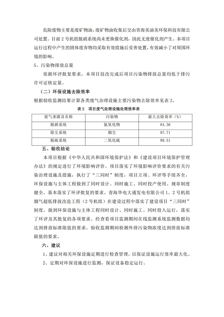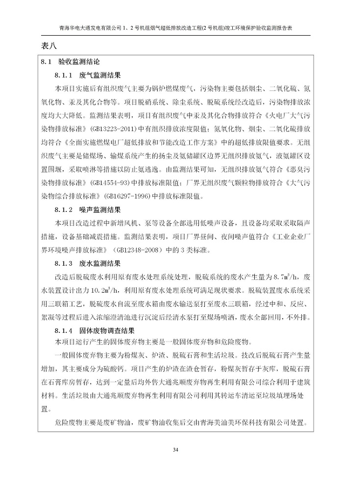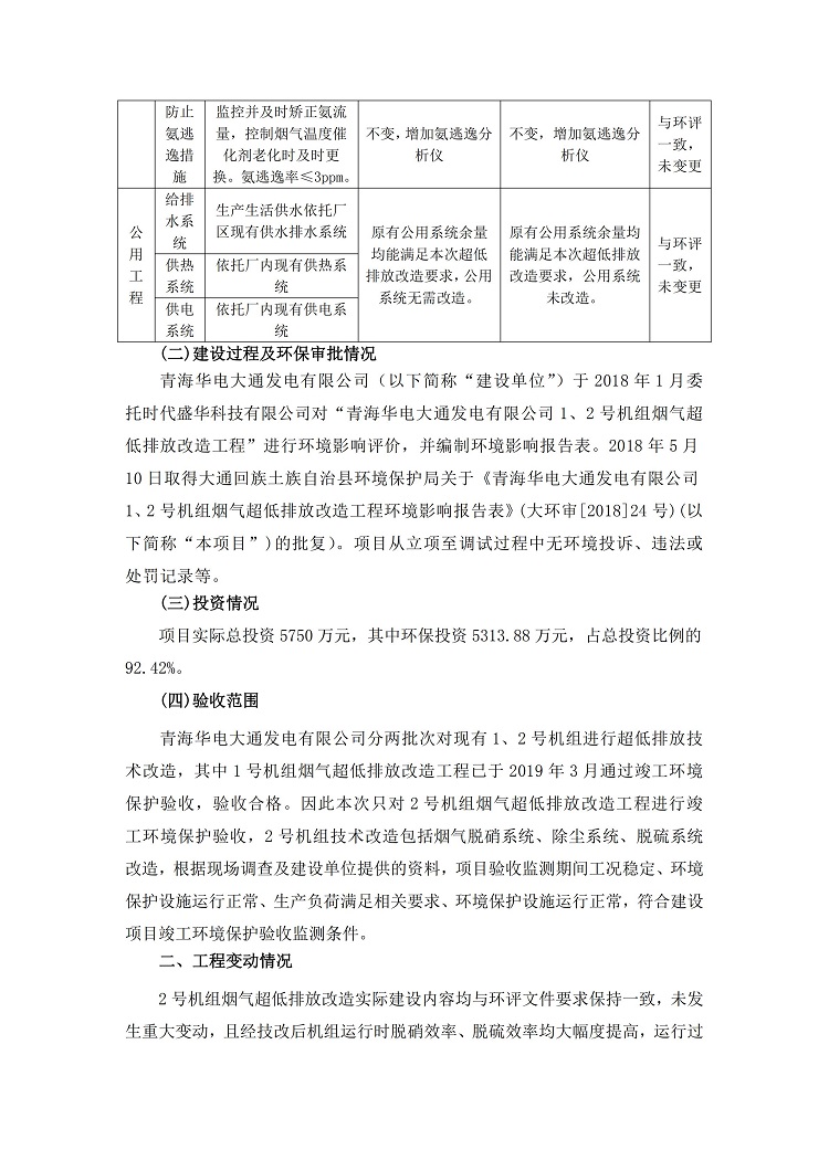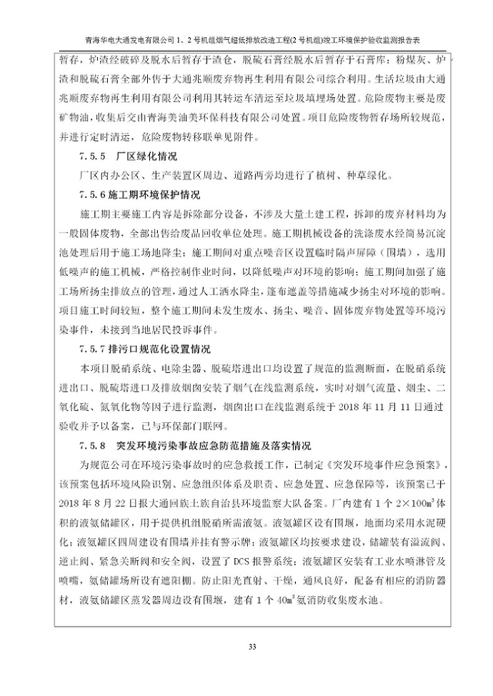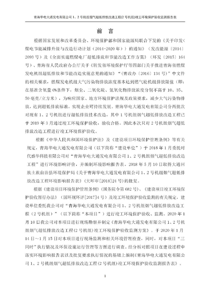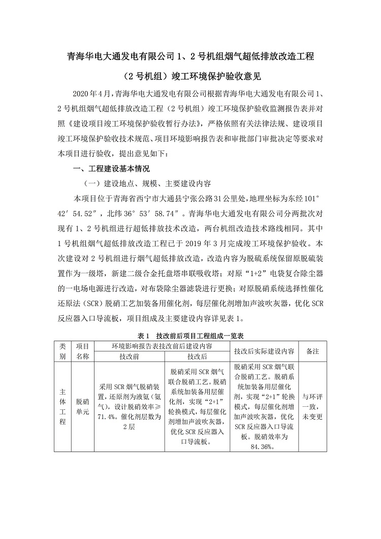 根據(jù)中華人民共和國(guó)國(guó)務(wù)院令第682號(hào)《國(guó)務(wù)院關(guān)于修改〈建設(shè)項(xiàng)目環(huán)境保護(hù)管理?xiàng)l例〉的決定》和《建設(shè)項(xiàng)目竣工環(huán)境保護(hù)驗(yàn)收暫行辦法》(國(guó)務(wù)院令682號(hào)),青海華電大通發(fā)電有限公司1、2號(hào)機(jī)組煙氣超低排放改造工程(2號(hào)機(jī)組) (包括竣工環(huán)境保護(hù)驗(yàn)收監(jiān)測(cè)報(bào)告表和驗(yàn)收意見(jiàn))公示如下。 一、項(xiàng)目名稱:青海華電大通發(fā)電有限公司1、2號(hào)機(jī)組煙氣超低排放改造工程(2號(hào)機(jī)組) 竣工環(huán)境保護(hù)驗(yàn)收監(jiān)測(cè)報(bào)告表 二、地點(diǎn):青海省西寧市大通縣寧張公路31公里處 三、建設(shè)單位:青海華電大通發(fā)電有限公司 四、建設(shè)內(nèi)容:2號(hào)機(jī)組煙氣超低排放改造,2號(hào)機(jī)組改造內(nèi)容為脫硫系統(tǒng)保留原脫硫裝置作為一級(jí)塔,新建二級(jí)合金托盤(pán)塔串聯(lián)吸收塔;對(duì)原“1+2”電袋復(fù)合除塵器的一電場(chǎng)電源進(jìn)行改造,對(duì)布袋除塵器濾袋進(jìn)行更換;對(duì)原脫硝系統(tǒng)選擇性催化還原法(SCR)脫硝工藝加裝備用催化劑,每層催化劑增加聲波吹灰器,優(yōu)化SCR反應(yīng)器入口導(dǎo)流板。 五、聯(lián)系人:馬世敏 六、聯(lián)系電 話:0971-6515411 七、公示時(shí)間:二〇二〇年四月二十九日至二〇二〇年五月二十八日 公示期間,對(duì)上述公示內(nèi)容如有異議,請(qǐng)以書(shū)面形式反饋,個(gè)人須署真實(shí)姓名,單位須加蓋公章。
