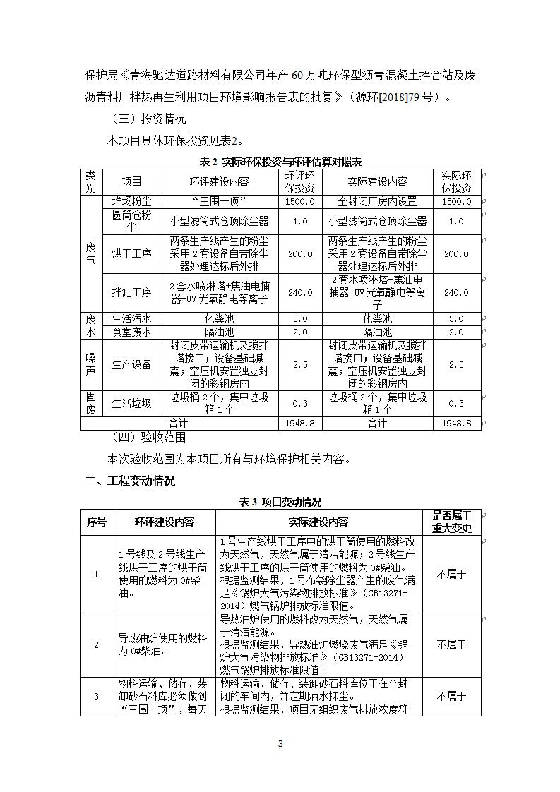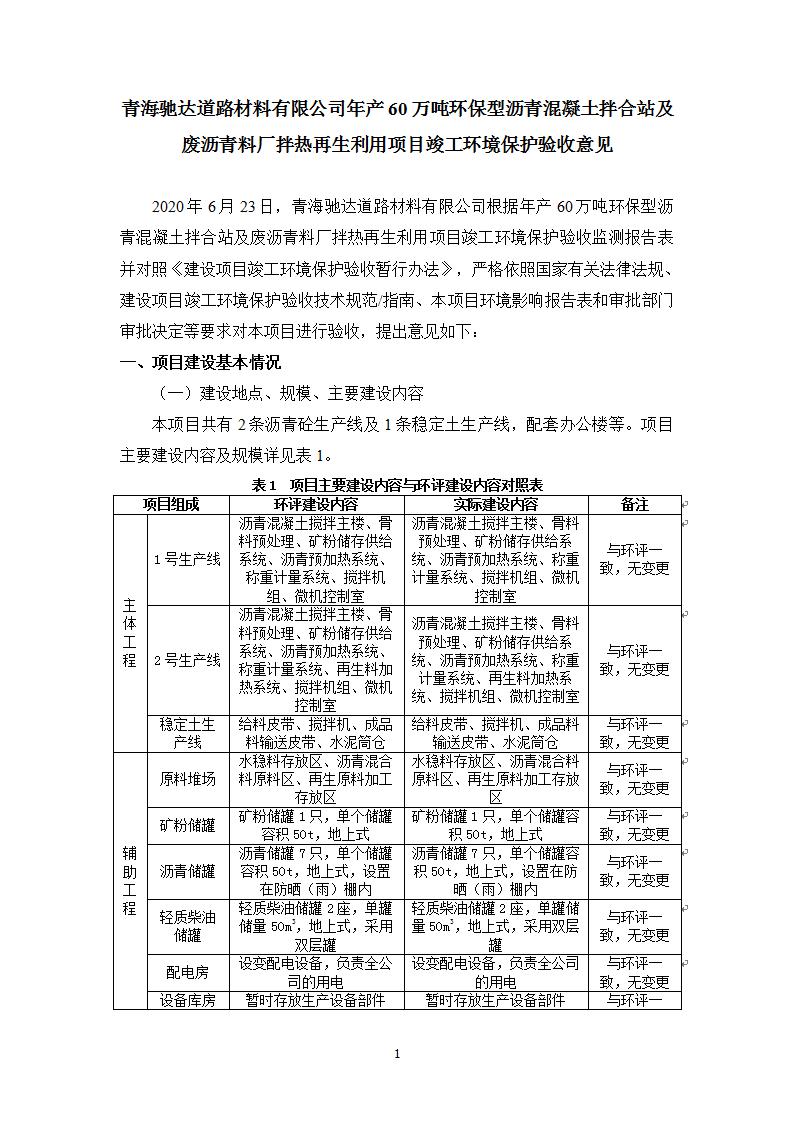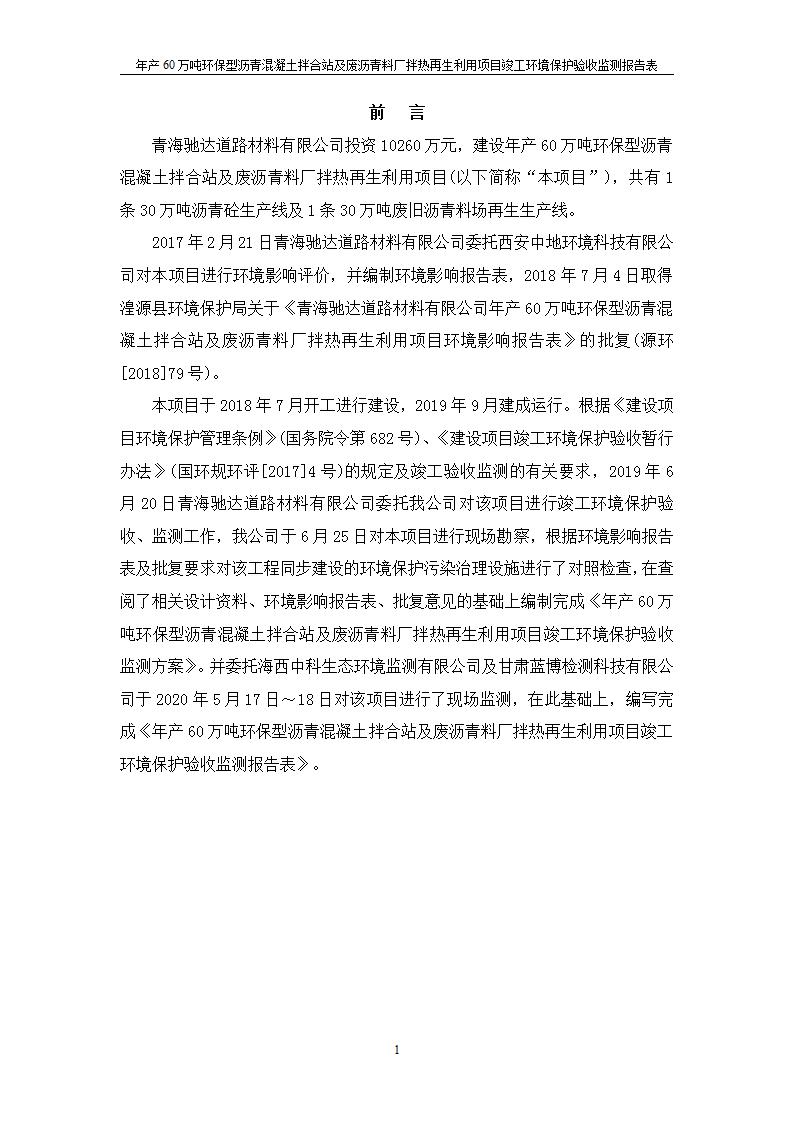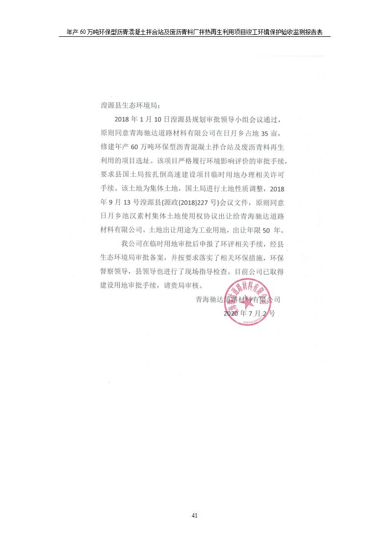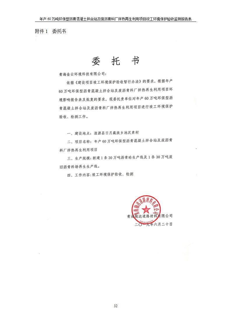 根據(jù)中華人民共和國(guó)國(guó)務(wù)院令第682號(hào)《國(guó)務(wù)院關(guān)于修改〈建設(shè)項(xiàng)目環(huán)境保護(hù)管理?xiàng)l例〉的決定》和《建設(shè)項(xiàng)目竣工環(huán)境保護(hù)驗(yàn)收暫行辦法》(國(guó)務(wù)院令682號(hào)),青海馳達(dá)道路材料有限公司年產(chǎn)60萬噸環(huán)保型瀝青混凝土拌合站及廢瀝青料廠拌熱再生利用項(xiàng)目竣工環(huán)境保護(hù)驗(yàn)收監(jiān)測(cè)報(bào)告表公示如下。 一、項(xiàng)目名稱:年產(chǎn)60萬噸環(huán)保型瀝青混凝土拌合站及廢瀝青料廠拌熱再生利用項(xiàng)目竣工環(huán)境保護(hù)驗(yàn)收監(jiān)測(cè)報(bào)告表 二、地點(diǎn):湟源縣日月藏族鄉(xiāng)池漢素村 三、建設(shè)單位:青海馳達(dá)道路材料有限公司 四、建設(shè)內(nèi)容:本項(xiàng)目共有2條瀝青砼生產(chǎn)線及1條穩(wěn)定土生產(chǎn)線,配套辦公樓等。 五、聯(lián)系人:楊工 六、聯(lián)系電 話:0971-6515411 七、公示時(shí)間:二〇二〇年七月六日至二〇二〇年七月三十一日 公示期間,對(duì)上述公示內(nèi)容如有異議,請(qǐng)以書面形式反饋,個(gè)人須署真實(shí)姓名,單位須加蓋公章。
