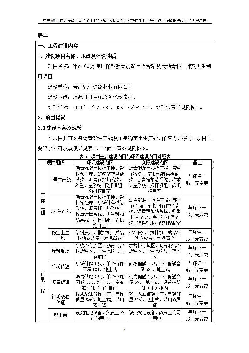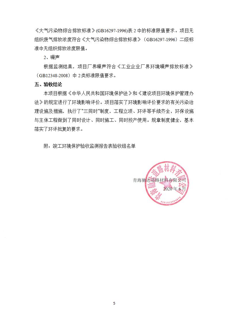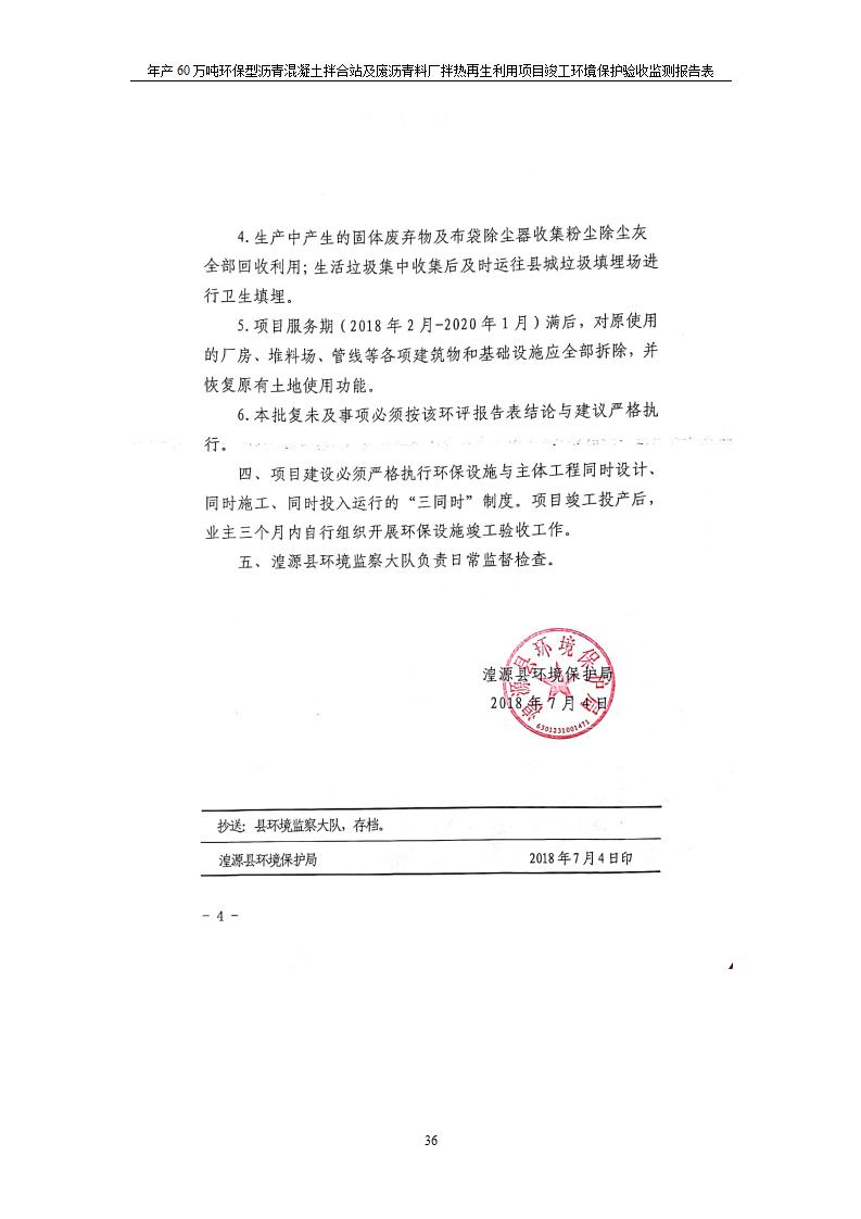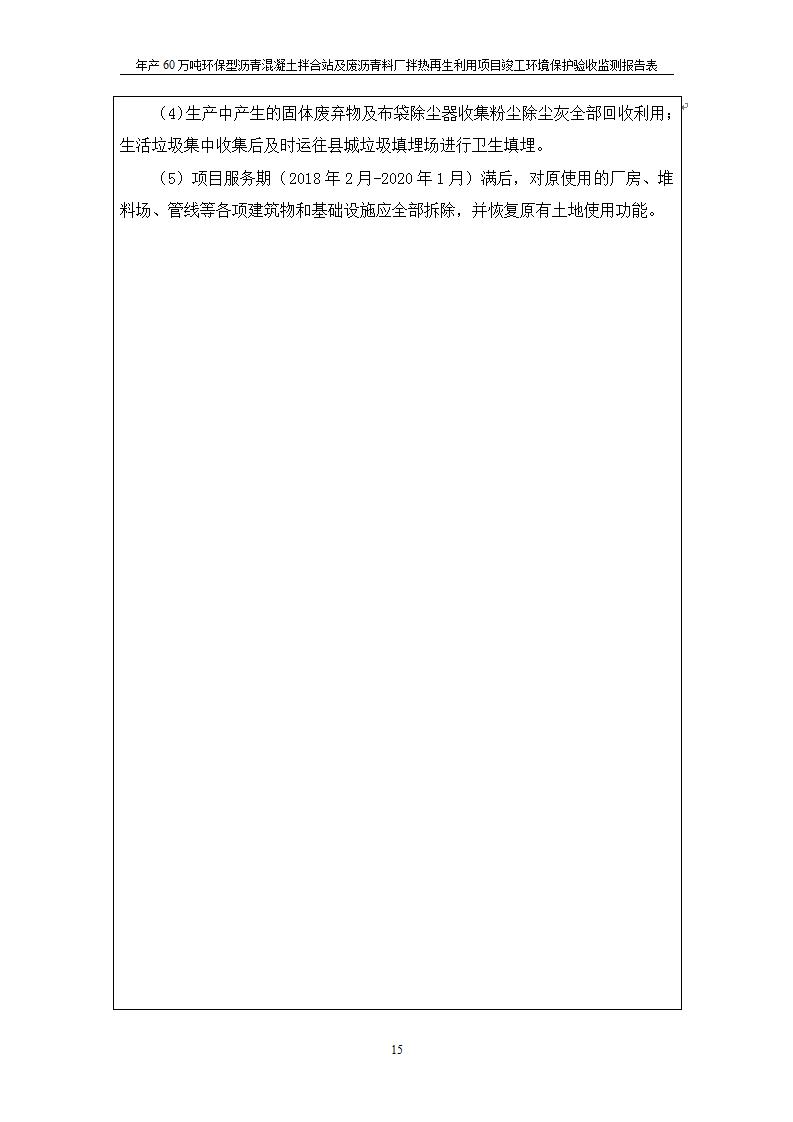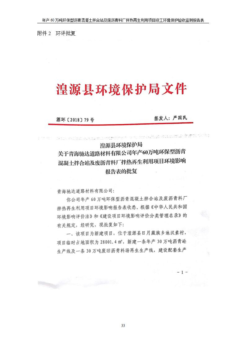 根據(jù)中華人民共和國(guó)國(guó)務(wù)院令第682號(hào)《國(guó)務(wù)院關(guān)于修改〈建設(shè)項(xiàng)目環(huán)境保護(hù)管理?xiàng)l例〉的決定》和《建設(shè)項(xiàng)目竣工環(huán)境保護(hù)驗(yàn)收暫行辦法》(國(guó)務(wù)院令682號(hào)),青海馳達(dá)道路材料有限公司年產(chǎn)60萬噸環(huán)保型瀝青混凝土拌合站及廢瀝青料廠拌熱再生利用項(xiàng)目竣工環(huán)境保護(hù)驗(yàn)收監(jiān)測(cè)報(bào)告表公示如下。 一、項(xiàng)目名稱:年產(chǎn)60萬噸環(huán)保型瀝青混凝土拌合站及廢瀝青料廠拌熱再生利用項(xiàng)目竣工環(huán)境保護(hù)驗(yàn)收監(jiān)測(cè)報(bào)告表 二、地點(diǎn):湟源縣日月藏族鄉(xiāng)池漢素村 三、建設(shè)單位:青海馳達(dá)道路材料有限公司 四、建設(shè)內(nèi)容:本項(xiàng)目共有2條瀝青砼生產(chǎn)線及1條穩(wěn)定土生產(chǎn)線,配套辦公樓等。 五、聯(lián)系人:楊工 六、聯(lián)系電 話:0971-6515411 七、公示時(shí)間:二〇二〇年七月六日至二〇二〇年七月三十一日 公示期間,對(duì)上述公示內(nèi)容如有異議,請(qǐng)以書面形式反饋,個(gè)人須署真實(shí)姓名,單位須加蓋公章。