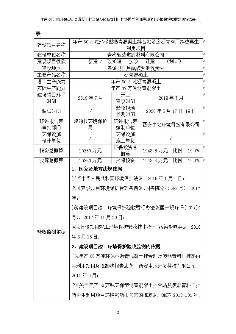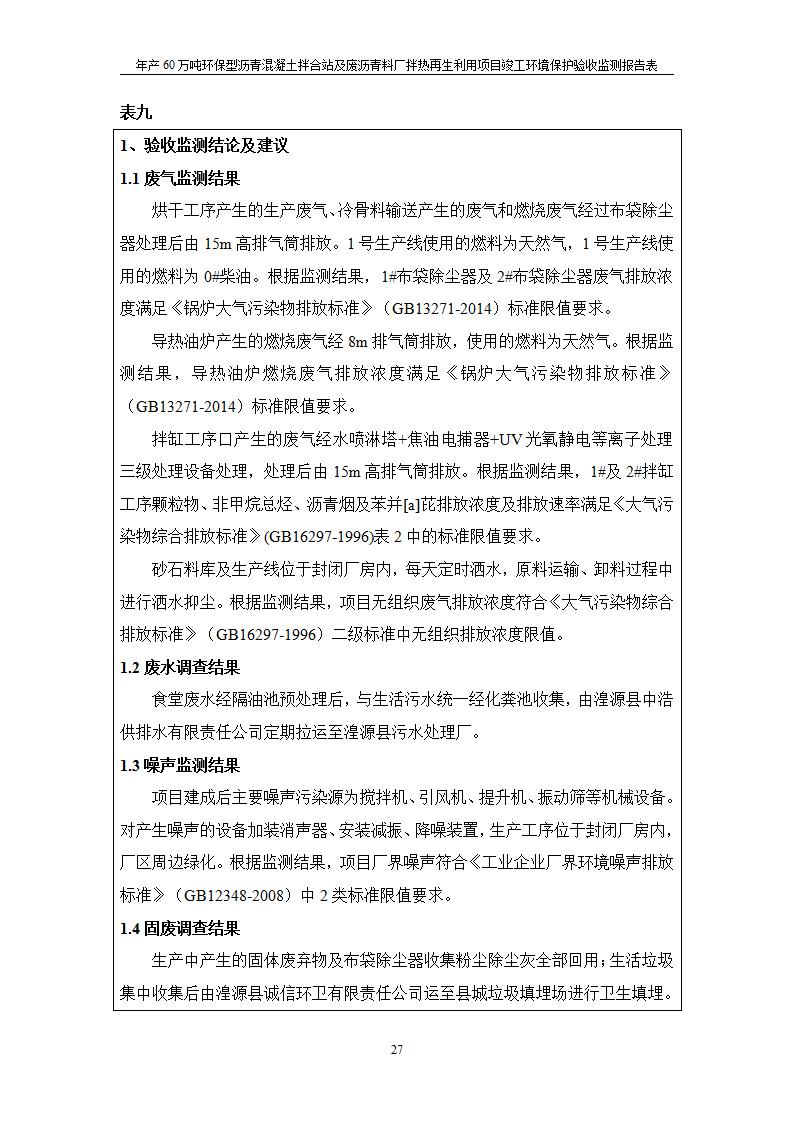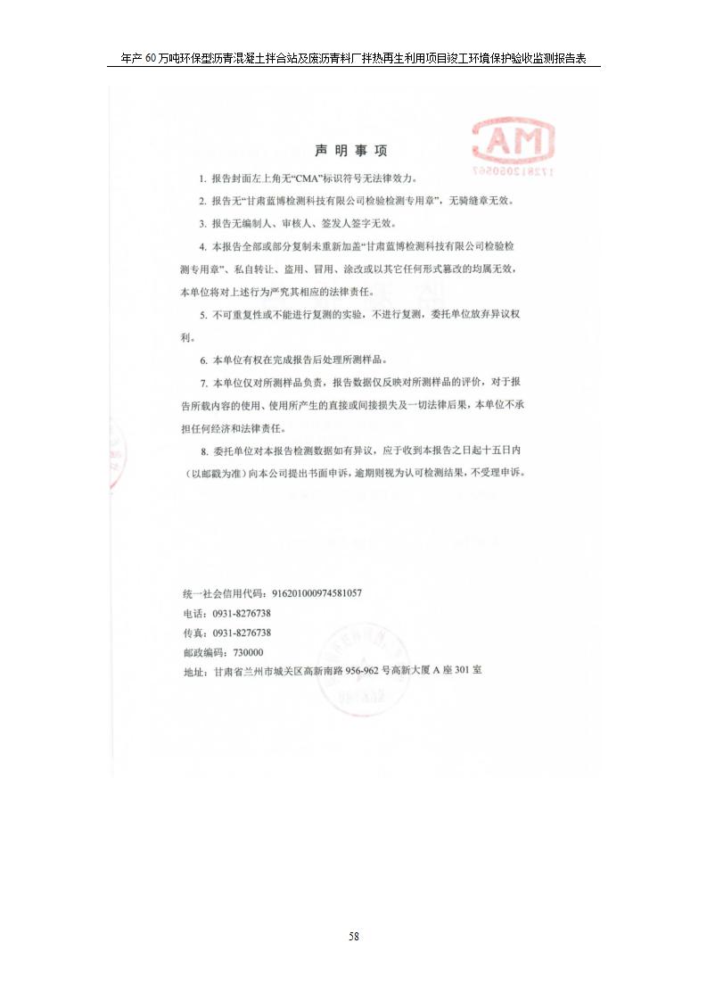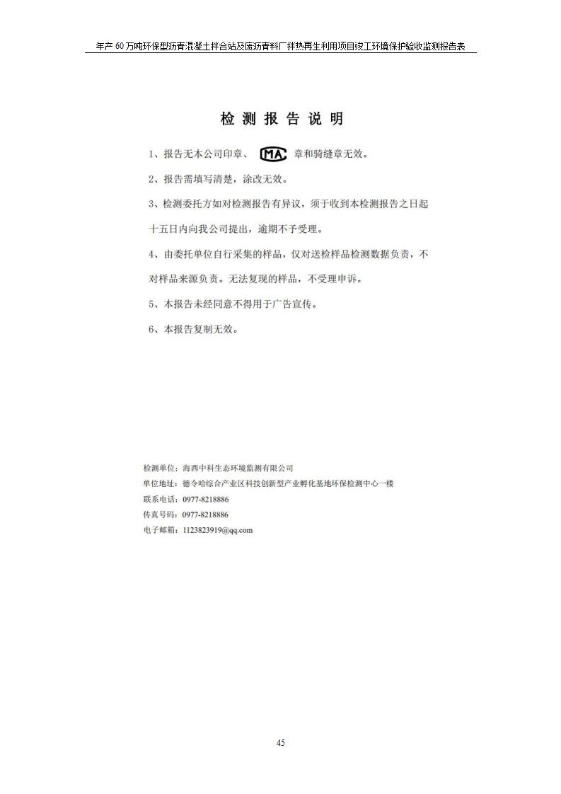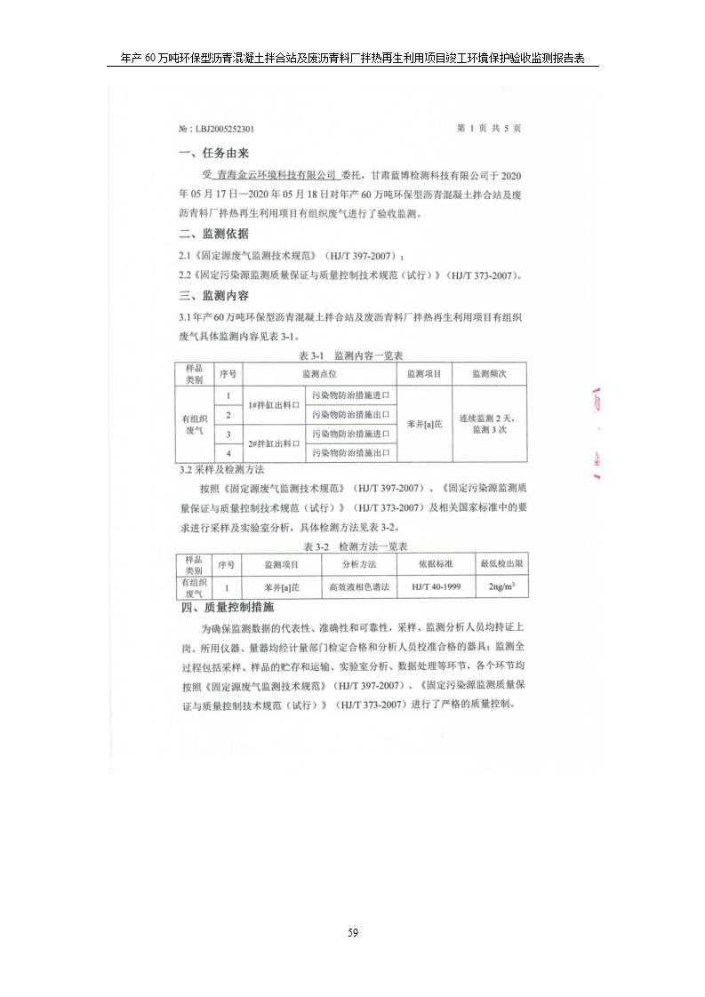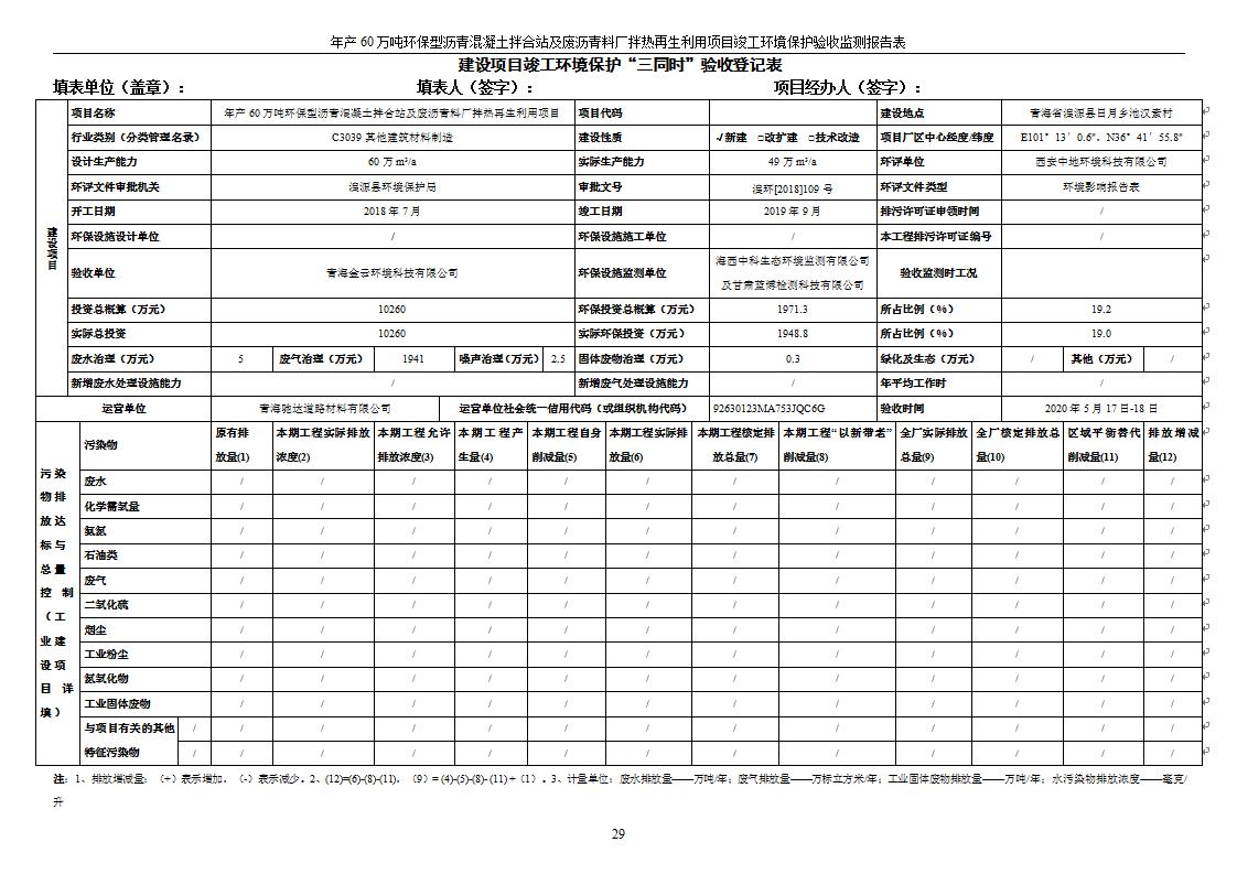 年產(chǎn)60萬噸環(huán)保型瀝青混凝土拌合站及廢瀝青料廠拌熱再生利用項(xiàng)目竣工環(huán)境保護(hù)驗(yàn)收監(jiān)測(cè)報(bào)告表公示發(fā)布日期:(2020-7-6) 點(diǎn)擊次數(shù):3797 |